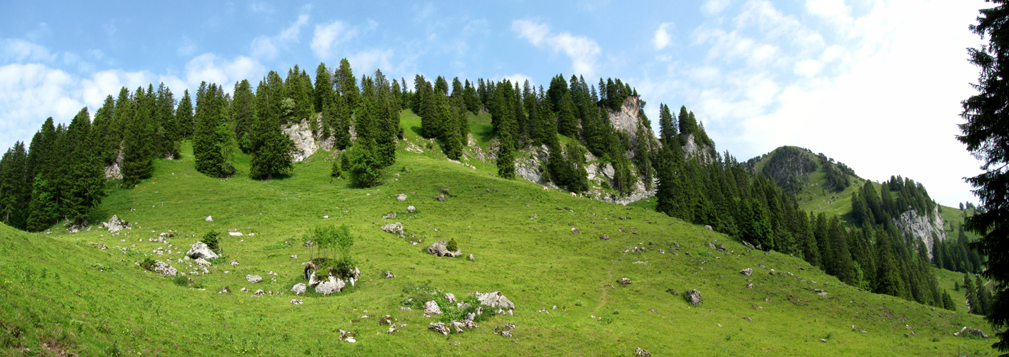 Breitbildfoto von der Roggenhütte 1538 m.ü.M. mit Blick Richtung Roggenstock