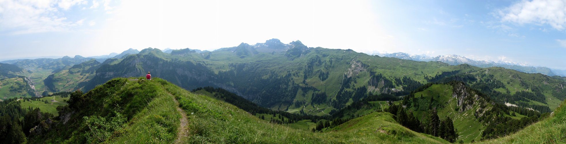 schönes Breitbildfoto vom Roggenstock Richtung Druesberg und Hoch-Ybrig. Auf dem Druesberg waren wir auch schon