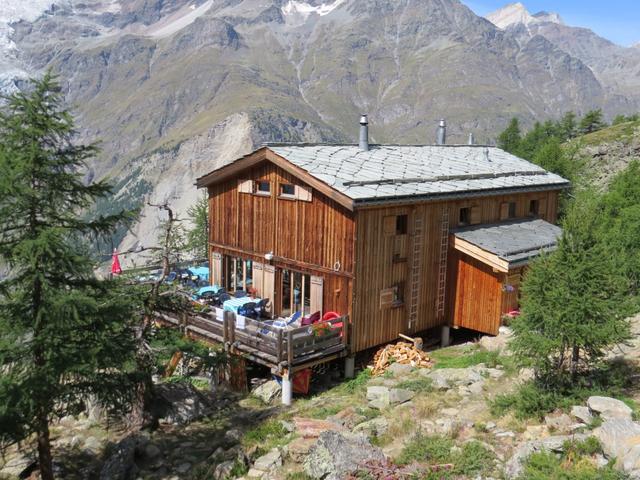 originell in Form eines Bergkristalls gebaut, klebt die Domhütte über den Steilflanken am Fuss des Festigletschers Datum 14.03.2016
