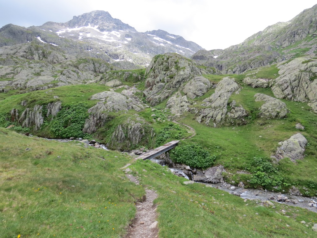 über eine Holzbrücke wird der Gebirgsbach Torrent des Erbets 1817 m.ü.M. überquert