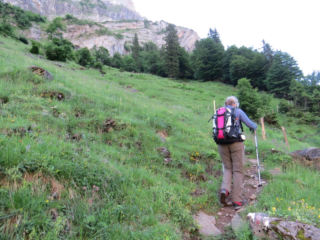hier biegen wir links ab und laufen auf der Alpstrasse weiter. Zwar länger, aber weniger steil