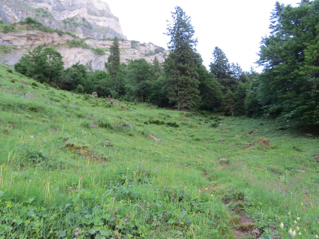 wir befinden uns unter dem Kabel der Transportseilbahn, die hinauf zur Alp Zingel geht