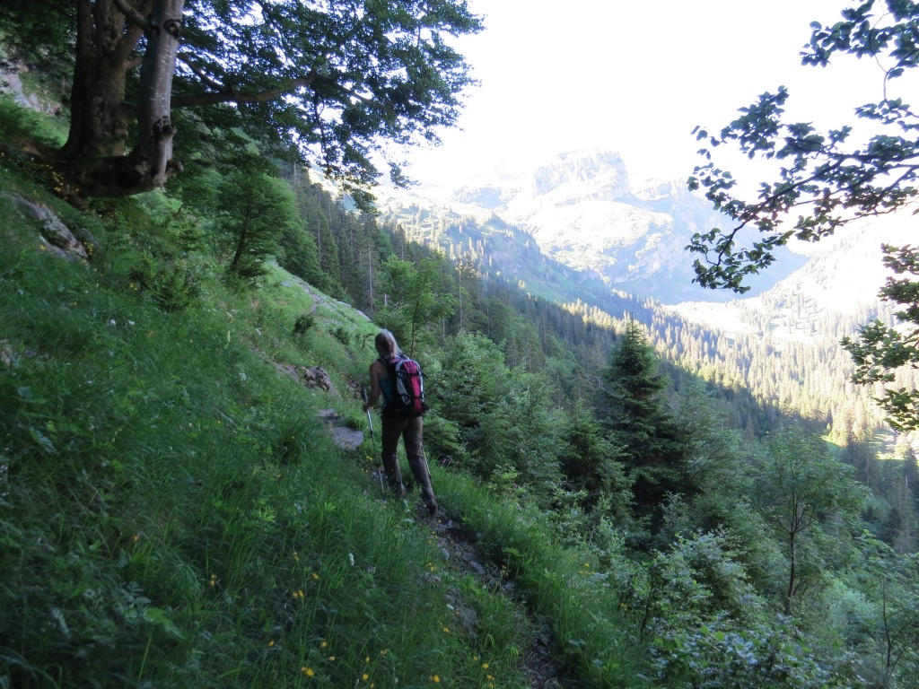 schattig und kühl ist es, als wir starten. Blick hinauf zum Wasserbergfirst