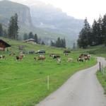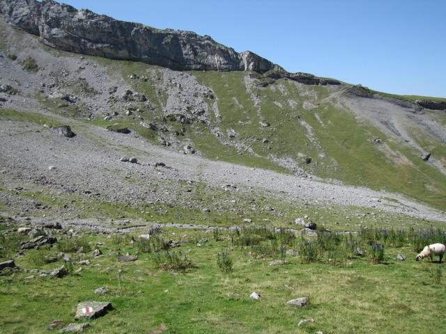 hier nur Stein und Geröll. Auf der anderen Seite vom Tal, grüne Weiden und Wiesen