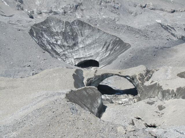 der Gletscherbach hat hier einen 30 Meter tiefen gruseligen Schlund aus dem Kalkfelsen gewaschen