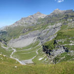Blick zurück zur Gamchilücke. Gut ersichtlich der Moränenweg