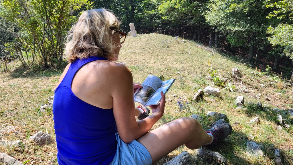 hinter dem Grenzstein führt ein Pfad hinunter zur Lichtung Petrinara...