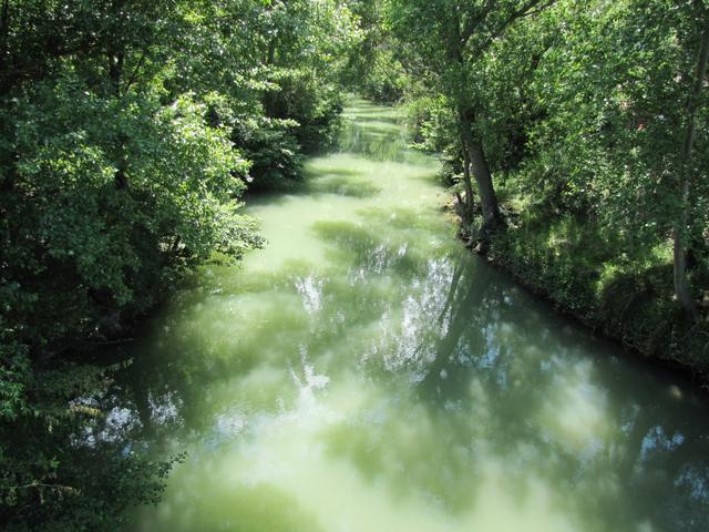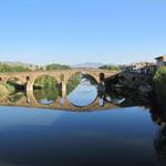 die Brücke spiegelt sich perfekt auf dem langsam dahin fliessenden Fluss Arga