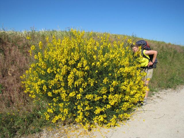 Mäusi versteckt sich hinter einem riesigen Ginsterstrauch