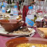 weisse Bohnen und Salat. Spanferkel und danach Dessert. Verschiedene Weine und Sekt