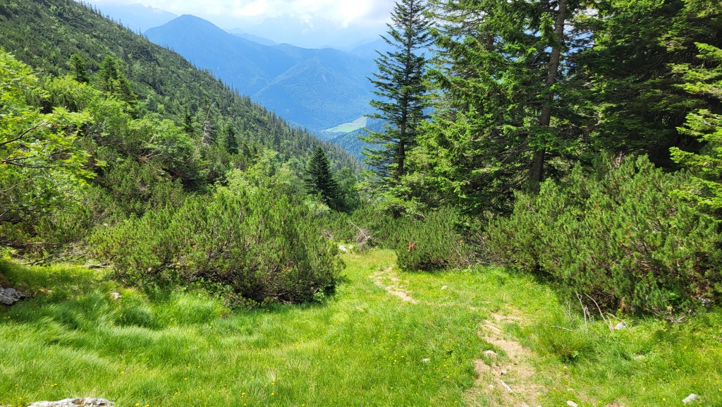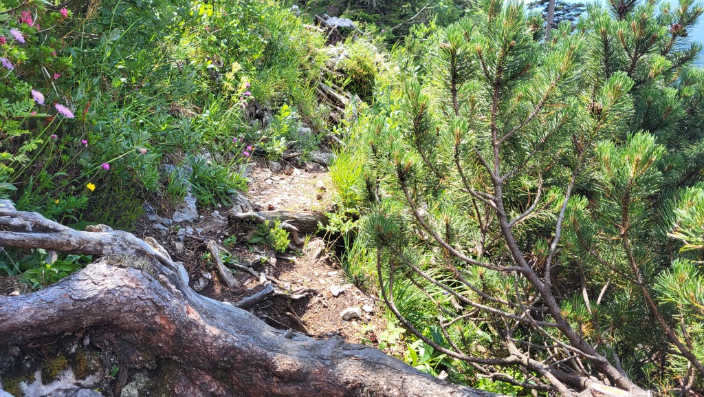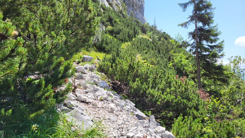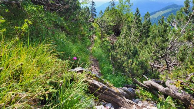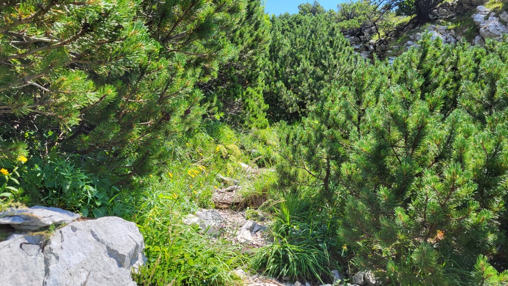 er führt über einen schmalen, wurzeligen Pfad durch Latschenbewuchs