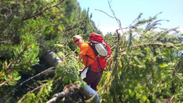 Legföhren müssen überwunden werden, mit den grossen Rucksäcken eine schweisstreibende Angelegenheit