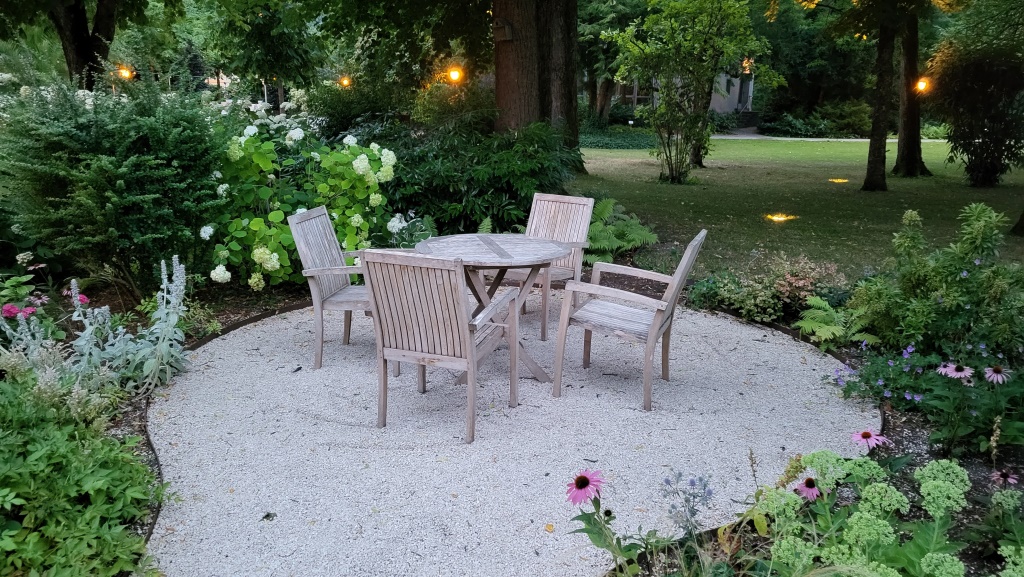 überall hat es kleine romantische Nischen mit Stühlen und Tischen