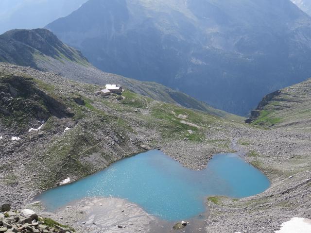 Breitbildfoto von der Friesenbergscharte aus gesehen mit Blick auf den Friesenbergsee mit Hütte und Grossen Mösler