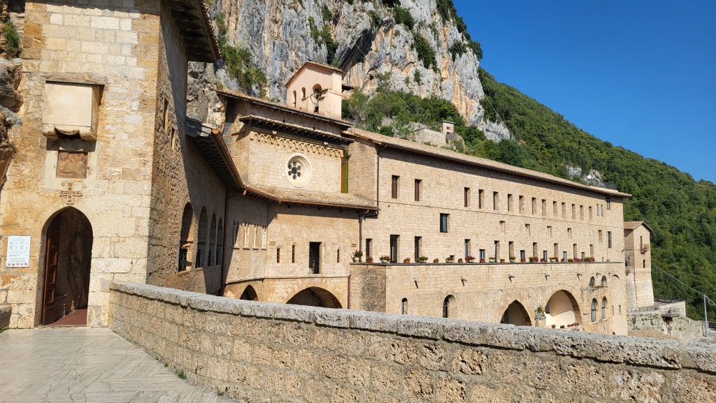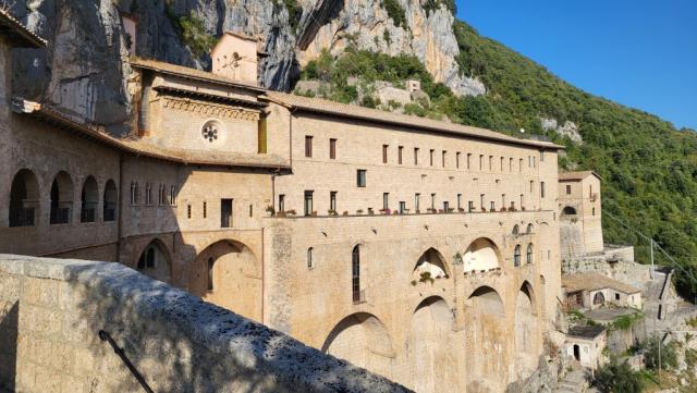 wir laufen über die Steintreppen hinauf zum Monastero e Sacro Speco (Heilige Felsspalte) San Benedetto,...