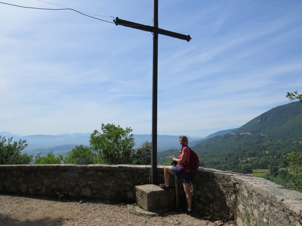 auf einer Anhöhe blicken wir zurück, und erspähen im Wald Greccio