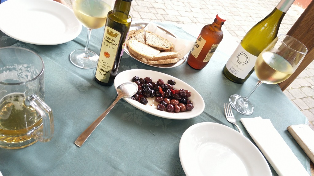 Giuseppe (Pino) empfängt uns mit Weisswein und Oliven aus der Region und selber gebackenes Brot