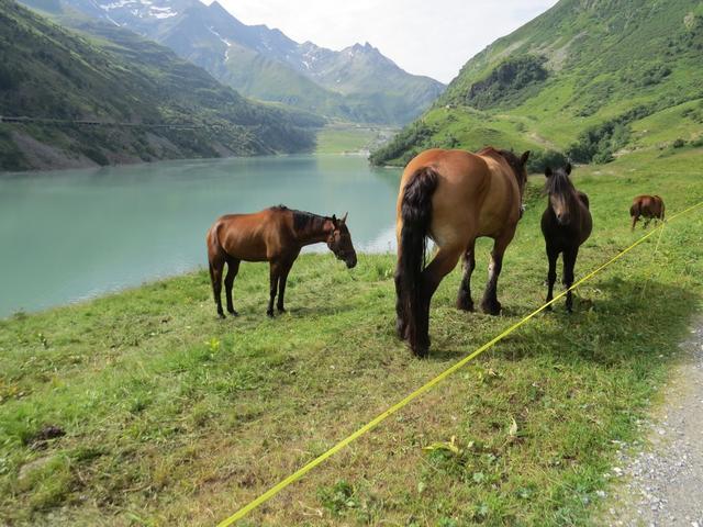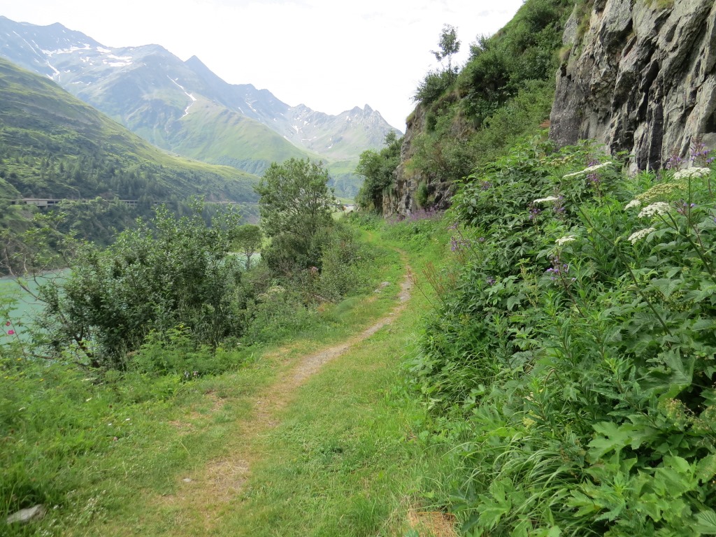 auf einer breiten Kiesstrasse gewinnen wir an Höhe und laufen rechts an der Staumauer vorbei