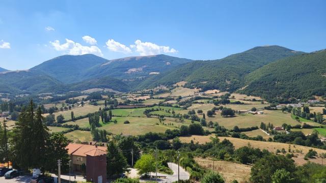 kurz vor Cascia blicken wir von der Strasse hinunter nach Cascia und zu unserem Hotel