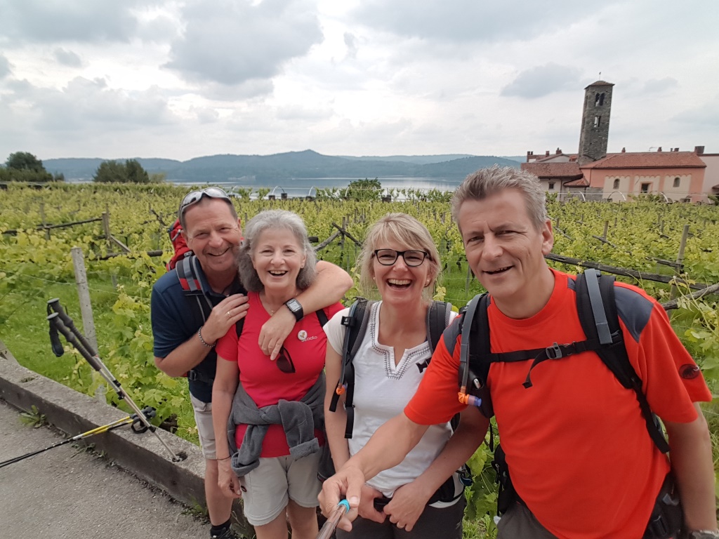wunderbar aussichtsreich wandern wir auf dem Höhenrücken dahin, der See di Viverone ist zu erkennen
