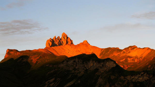 sehr schönes Breitbildfoto der Lobhörner. Wegen der aufgehender Sonne hat man das Gefühl sie brennen Datum 10.02.2017