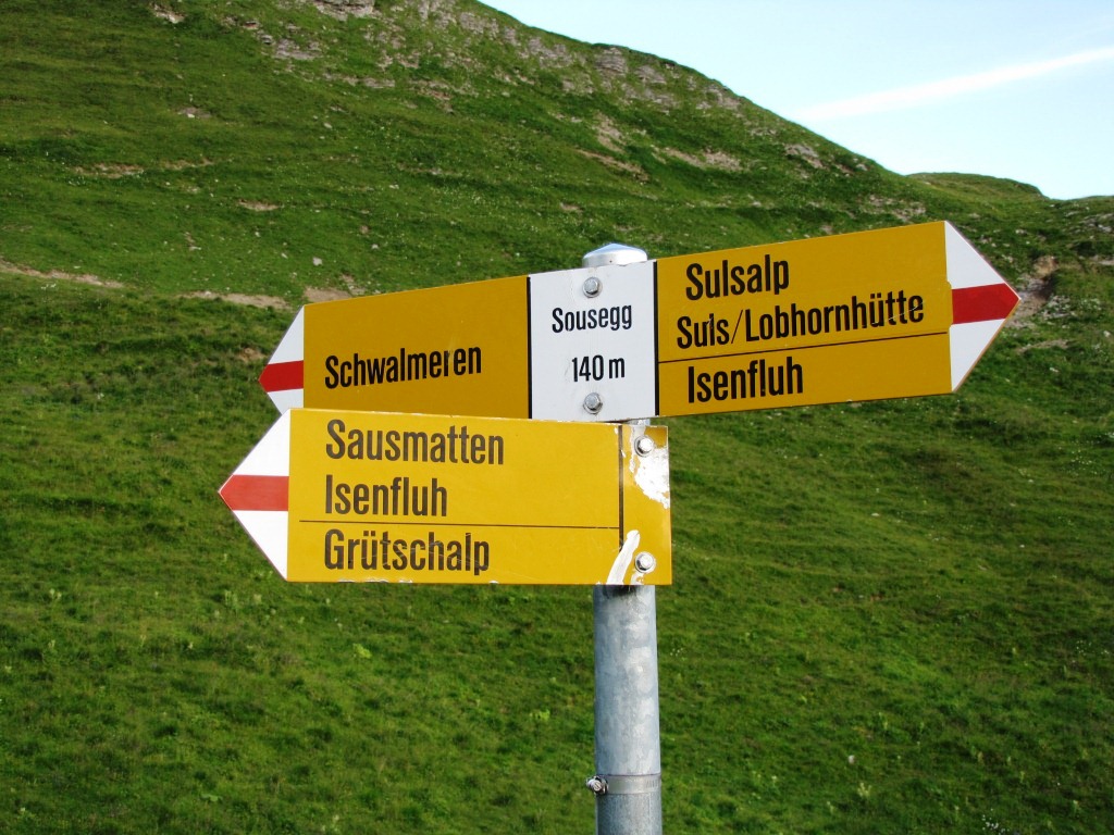 Wegweiser bei der Wegkreuzung auf der Sousegg 2140 m.ü.M. Datum 10.04.2013