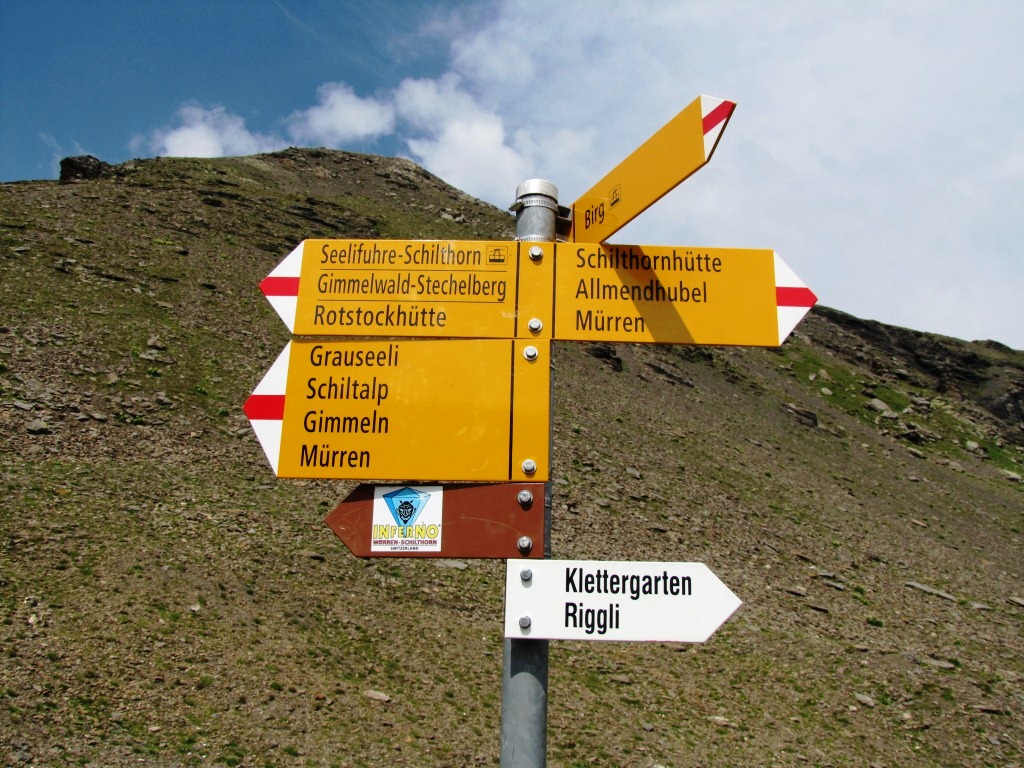 Wegweiser bei der Schilthornhütte 2432 m.ü.M. Datum 10.04.2013