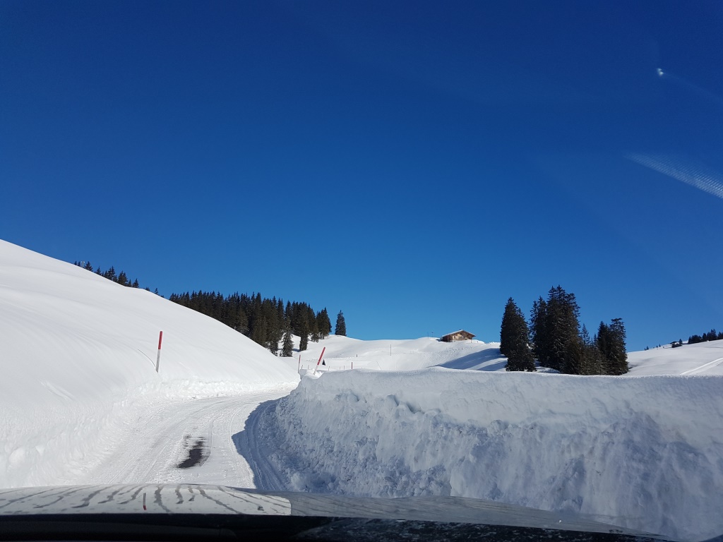 über das verschneite Bergsträsschen fahren wir an Tschiemen 1179 m.ü.M. vorbei Datum 10.04.2018