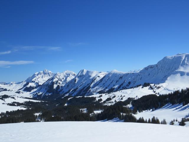 sehr schönes Breitbildfoto. Links die Alphäuser von Lägern. In der Bildmitte der Hohgant Datum 12.04.2018