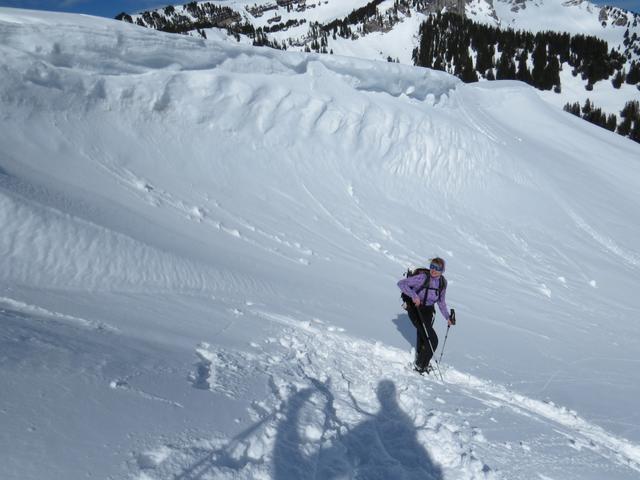 steil geht es auf der anderen Seite hinab. Was für ein Vergnügen im Tiefschnee hinunter zu rennen Datum 12.04.2018