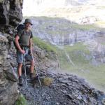 hier heisst es schnell laufen. Mehrere Bäche stürzen von weit oben auf den Wanderweg