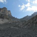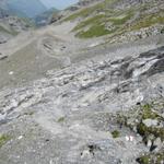 Blick runter zum toten Gamchigletscher. Der Gletscher ist mit Schutt überdeckt