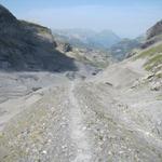 Blick zurück zur Gamchilücke. Gut ersichtlich der Moränenweg