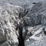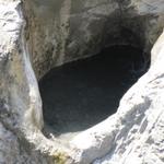 der Gletscherbach hat hier einen 30 Meter tiefen gruseligen Schlund aus dem Kalkfelsen gewaschen