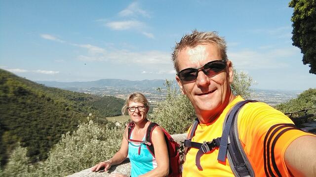 ganz weit weg erkennen wir Trevi und den Eremo Francescano delle Allodole. Wir grüssen dich Gaja