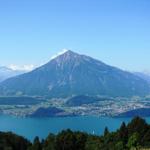 schönes Breitbildfoto mit dem Thunersee. Links der Niesen. Rechts der Stockhorn. Dort oben waren wir auch schon Datum 25.03.2013