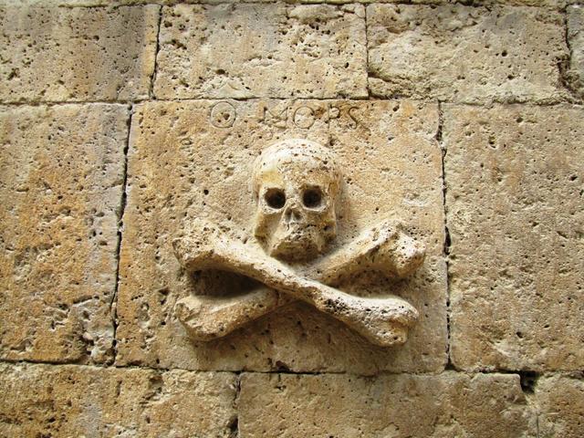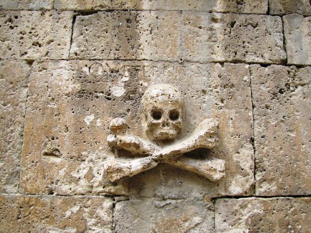 an der Aussenfassade der Iglesia de Santo Domingo 16.Jh. regen zwei steinerne Totenköpfe zum Nachdenken an Datum 08.07.2012