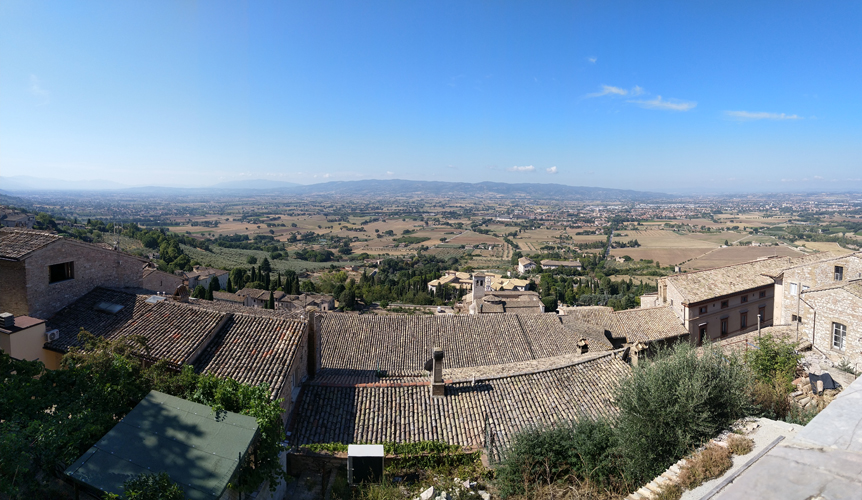 mit dem Blick auf die Dächer von Assisi und den Kirchturm der Abtei San Pietro verlassen wir die Kirche Datum 05.12.2020
