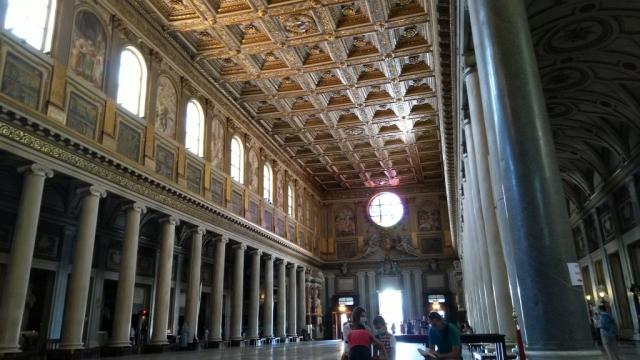 das riesige Mittelschiff mit den je zwanzig Marmorsäulen. Die Säulen stammen vom Tempel der Juno auf dem Aventin