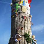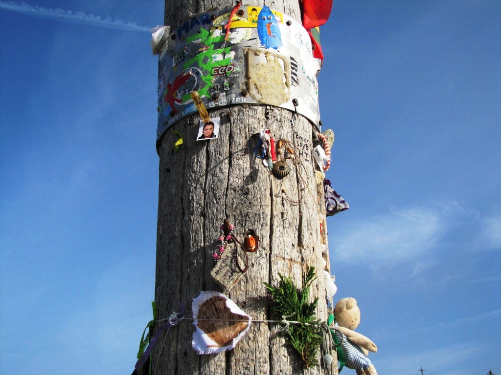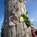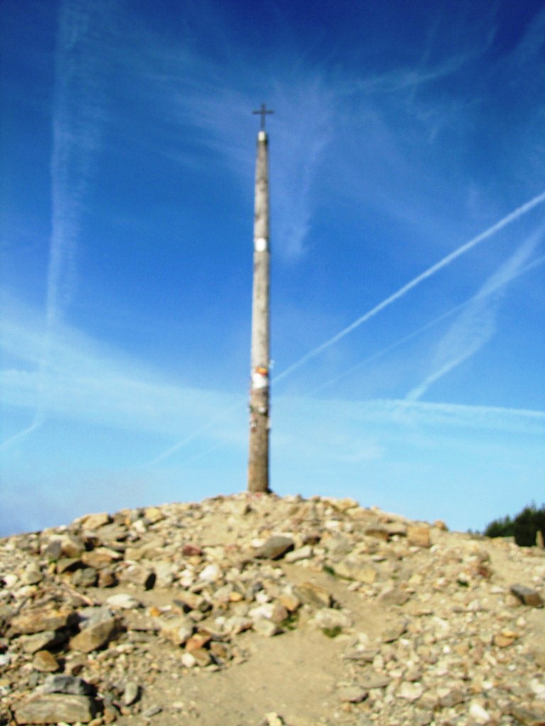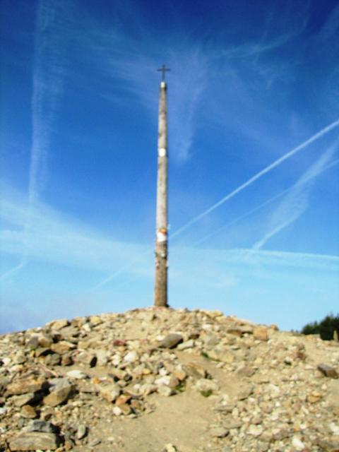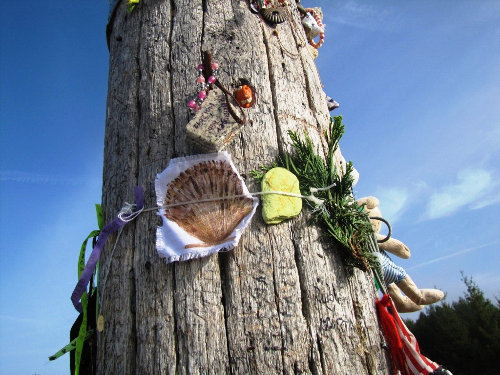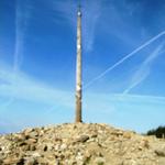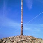 über einen gewaltigen Steinhaufen erhebt sich ein 5m hoher Eichenstamm, mit einem Eisenkreuz an der Spitze Datum 09.11.2012