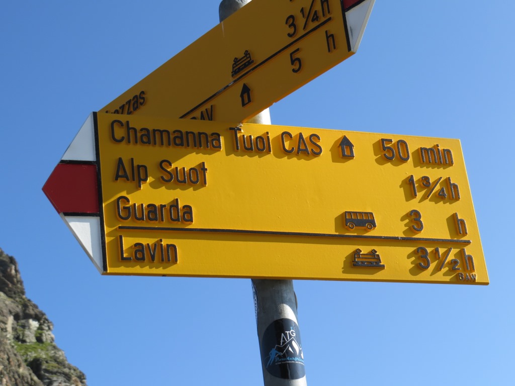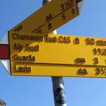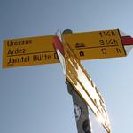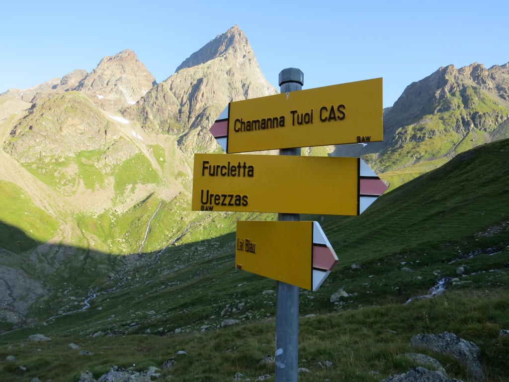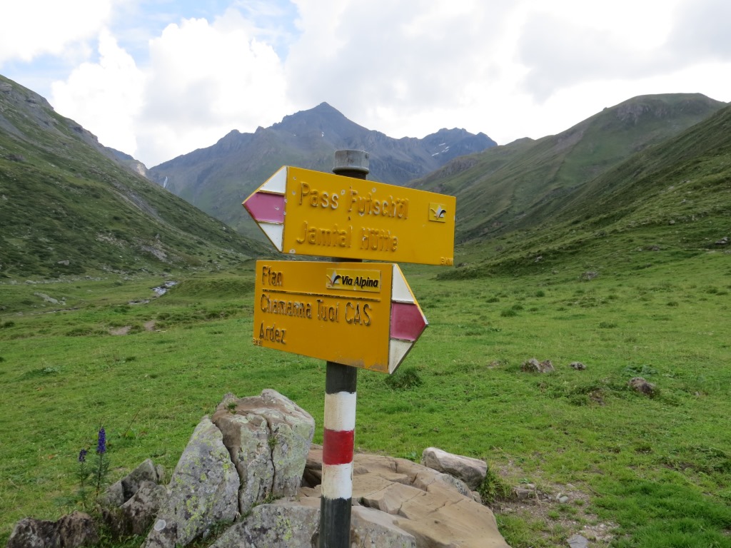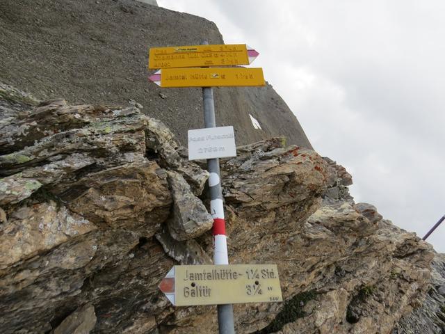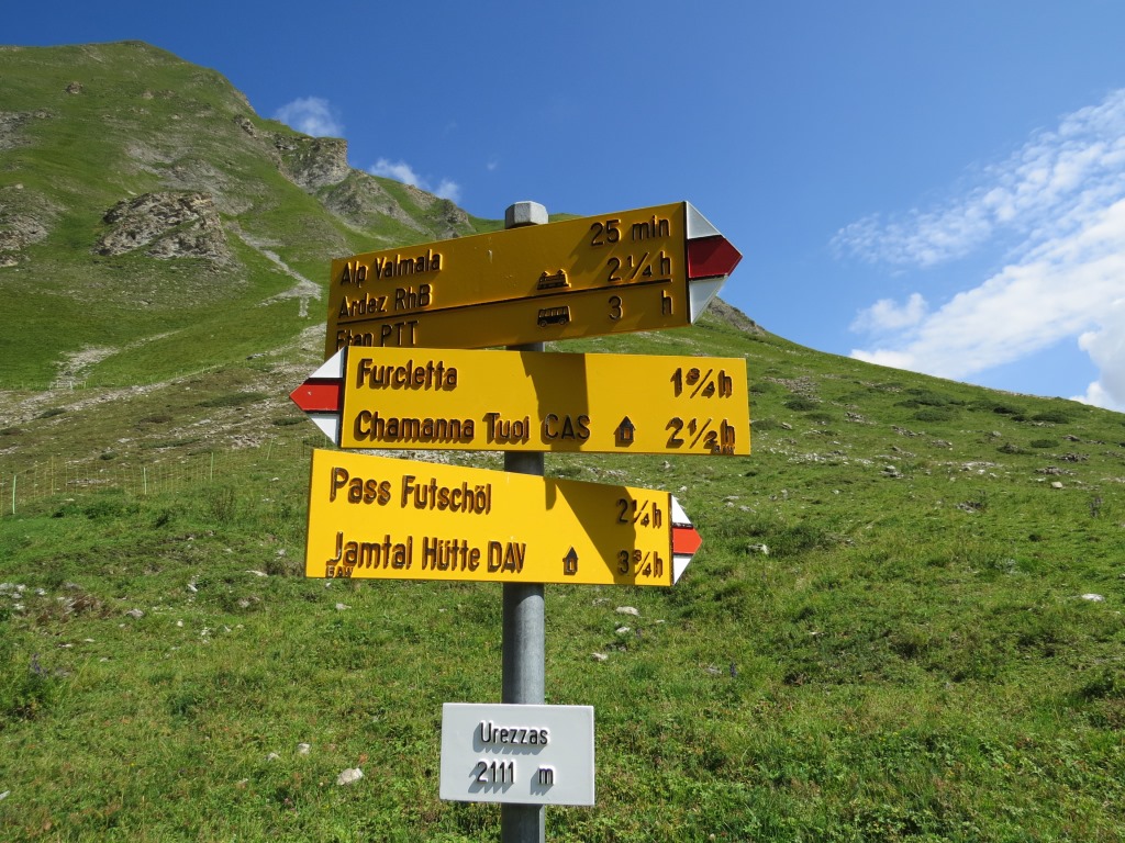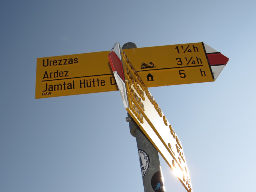 Wegweiser bei Urezzas. Um unser Tagesziel die Jamtalhütte zu erreichen, geht es über den Pass Futschöl