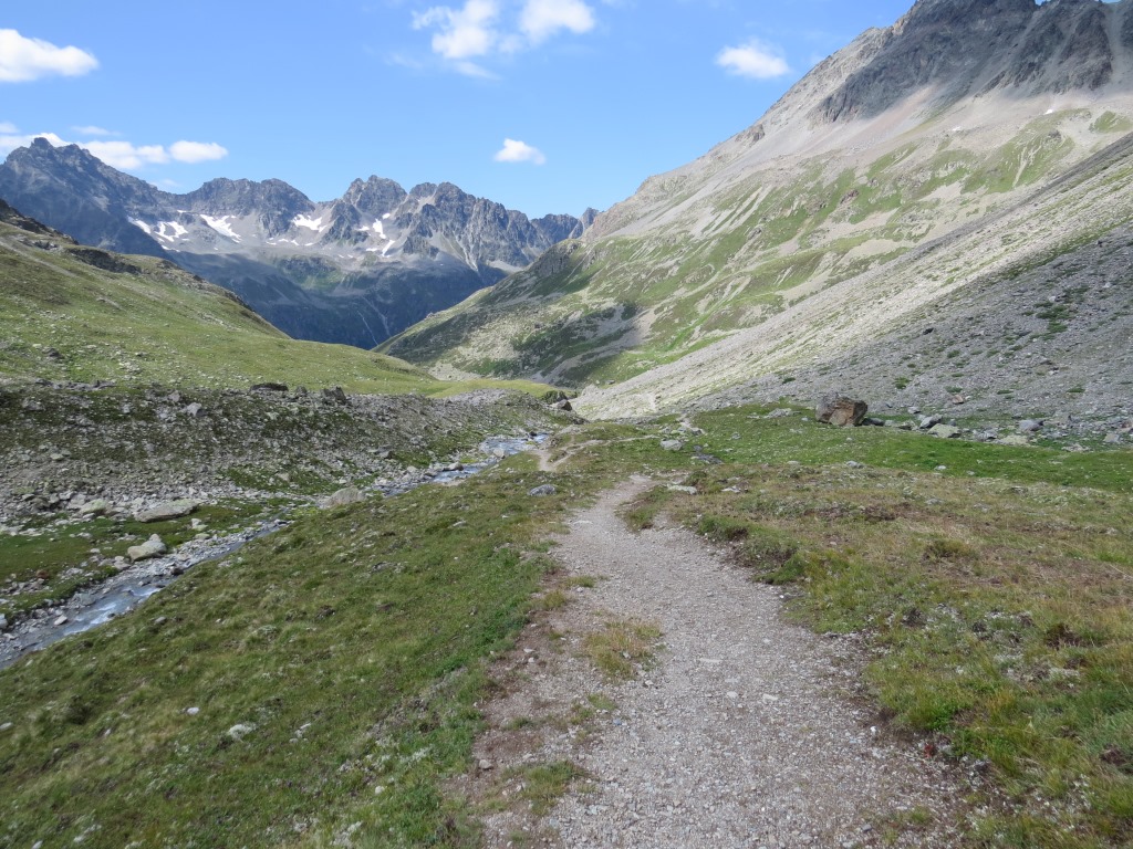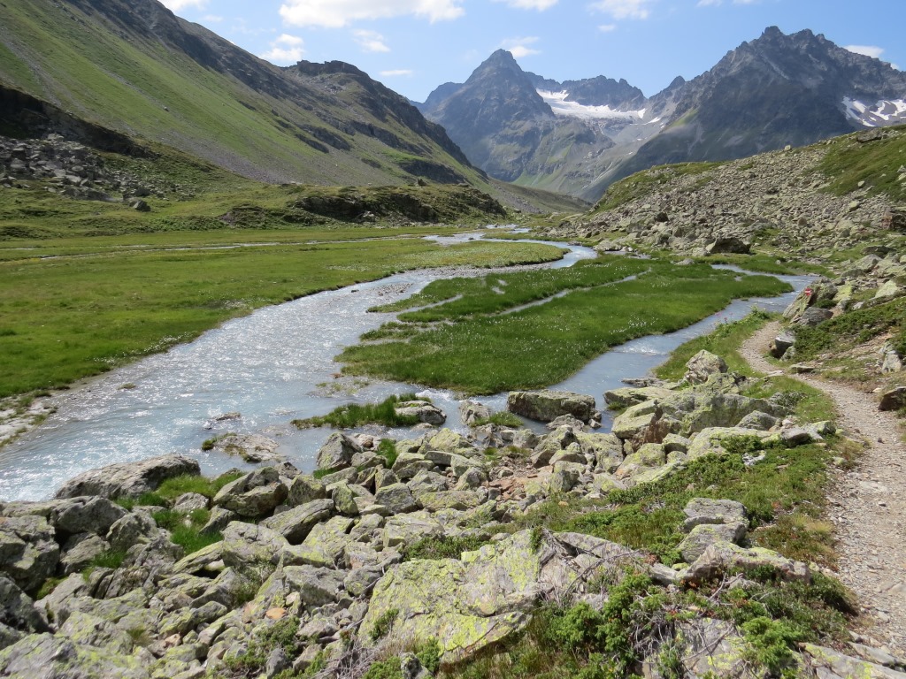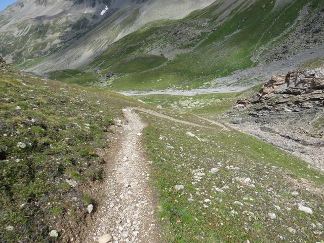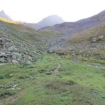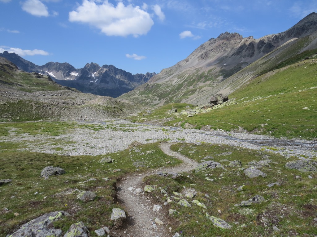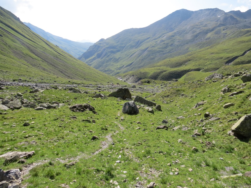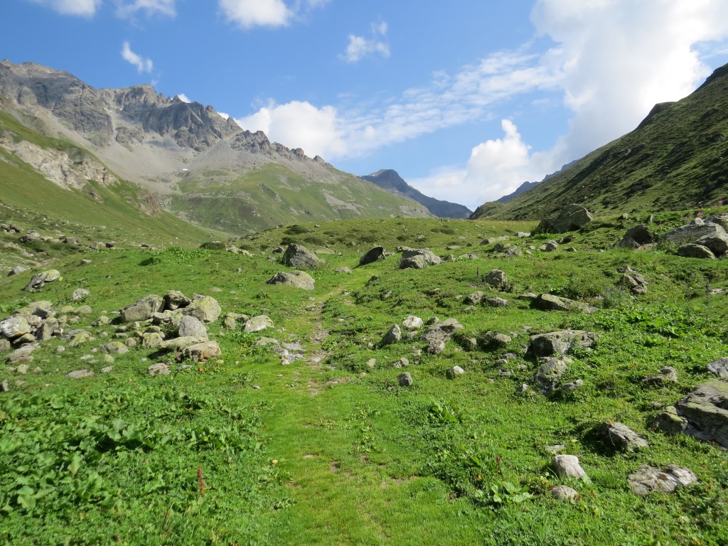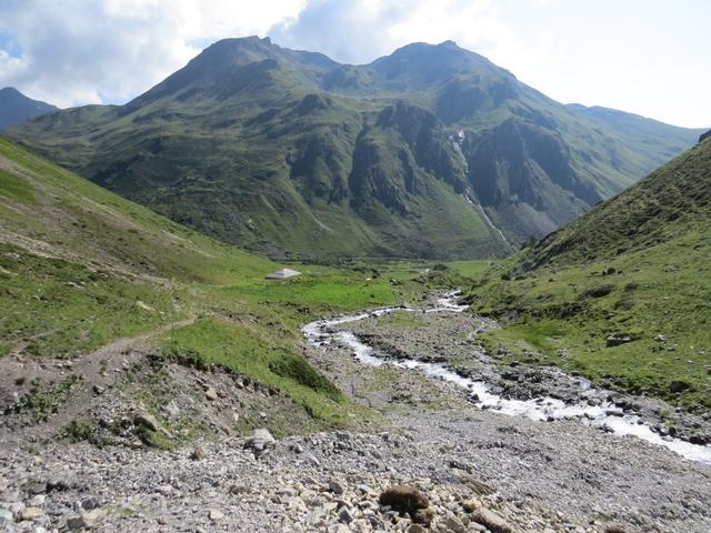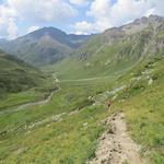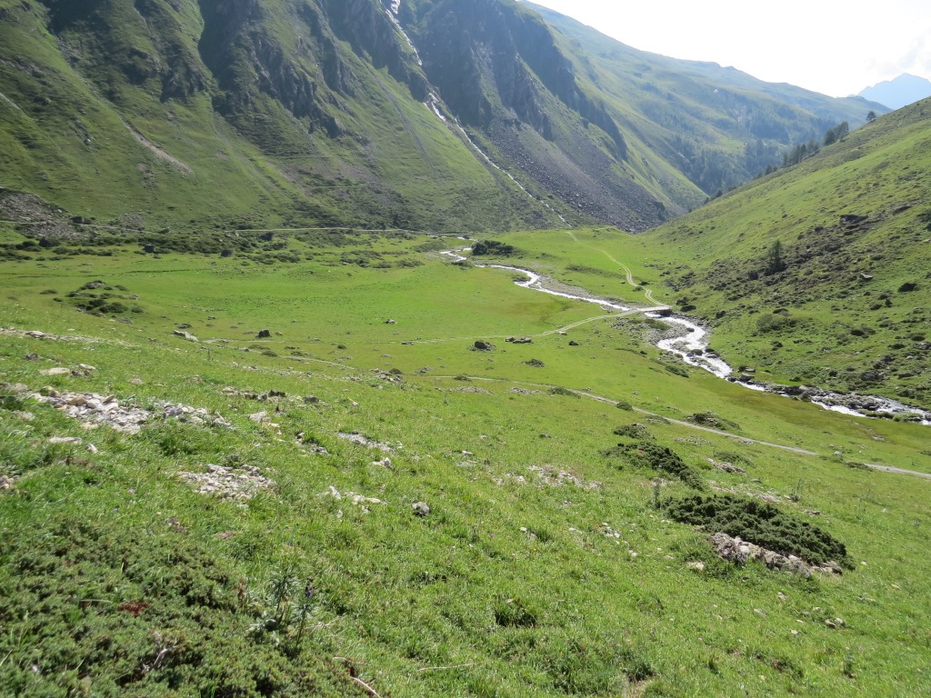 von der Weggabelung blicken wir in den Talboden hinunter und zur Chamonna Tuoi