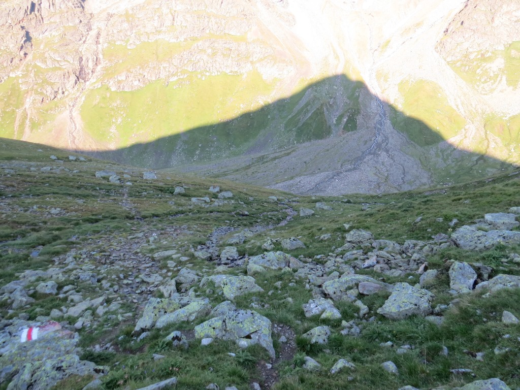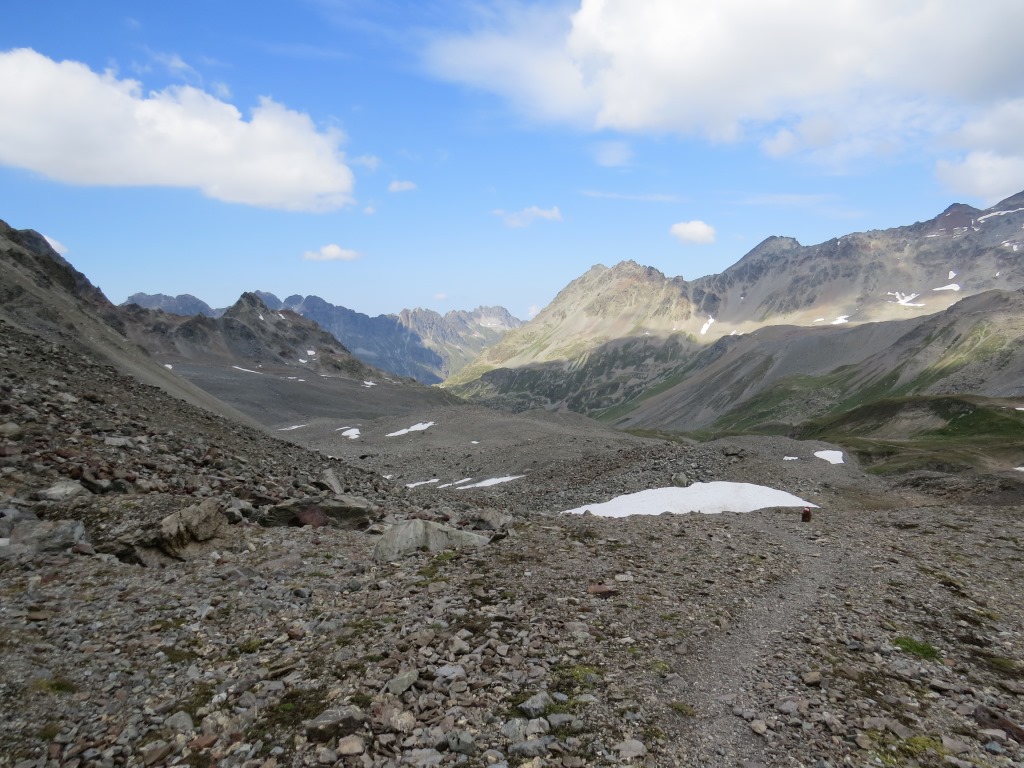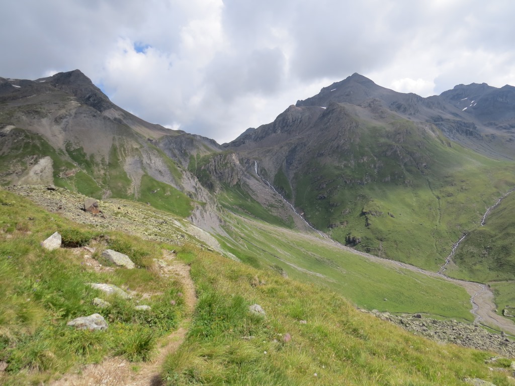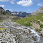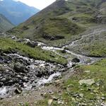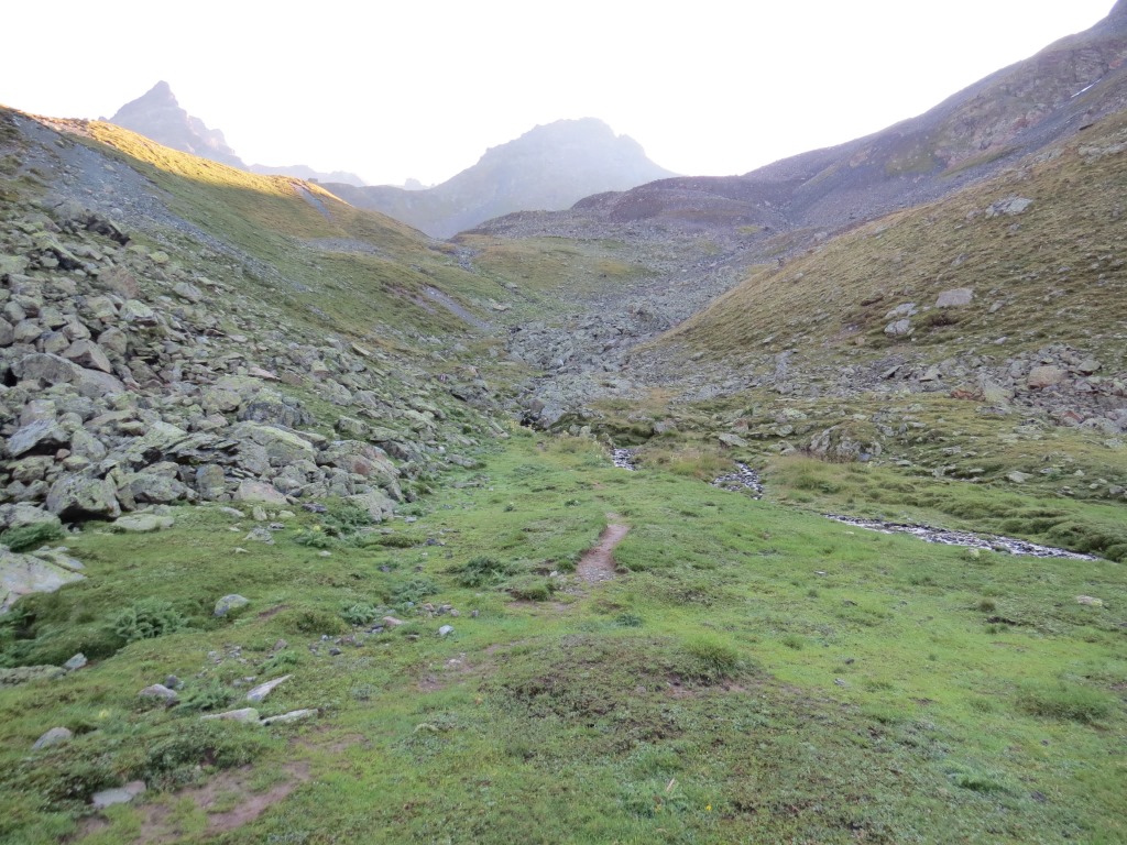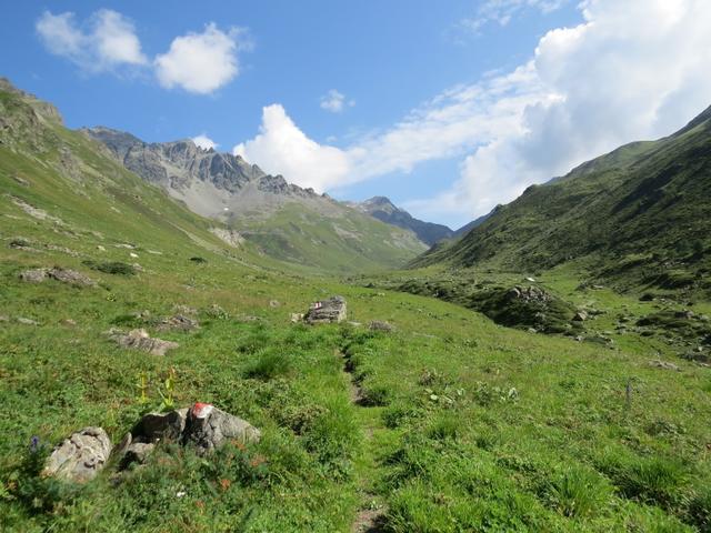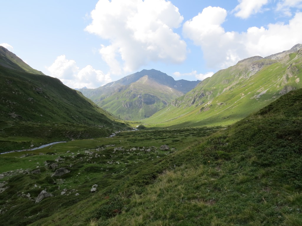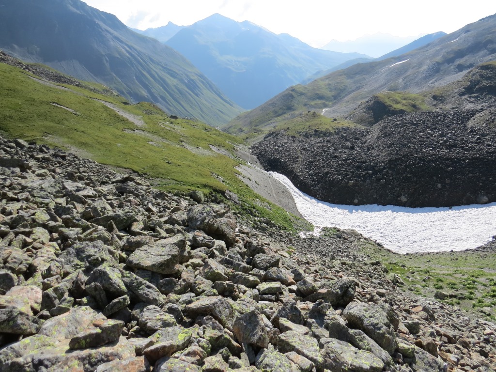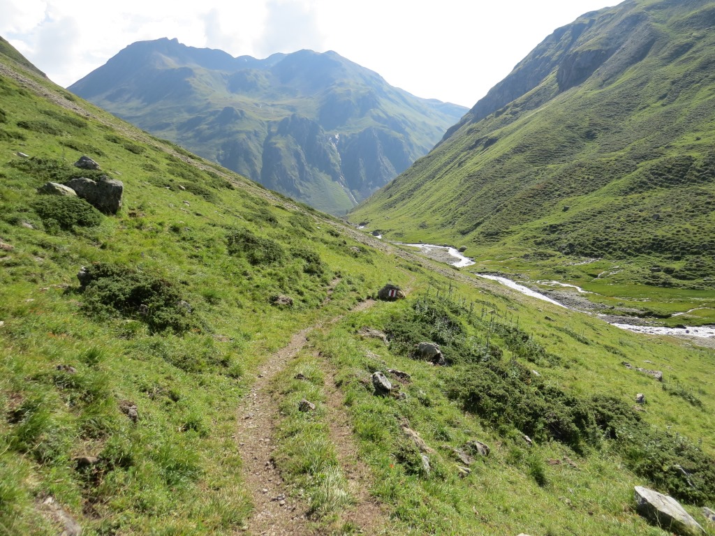 von der Weggabelung blicken wir in den Talboden hinunter und zur Chamonna Tuoi