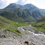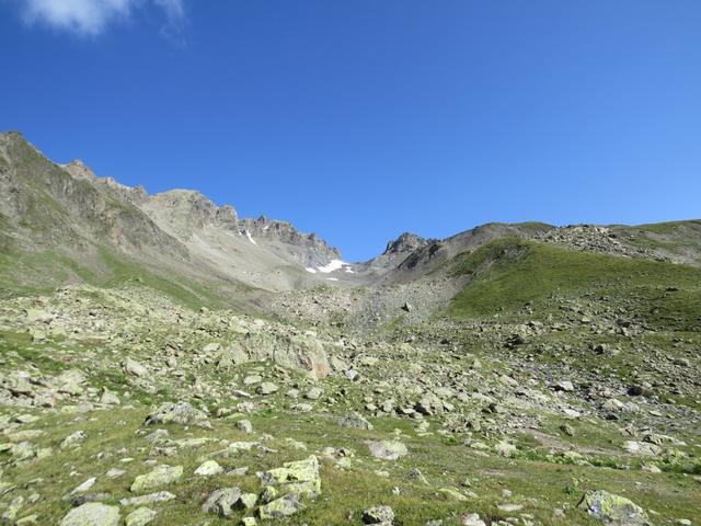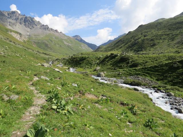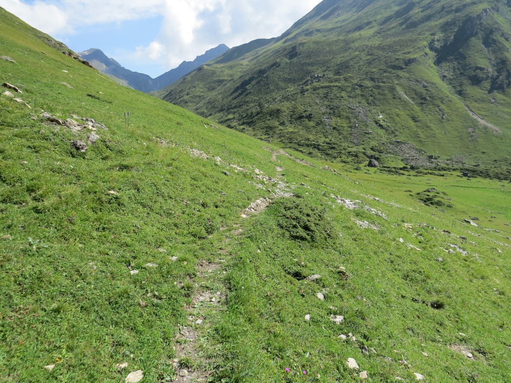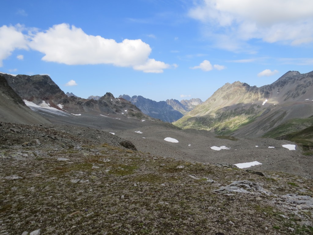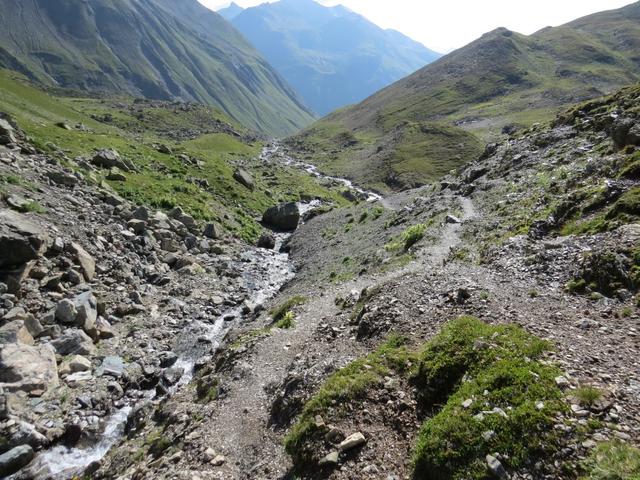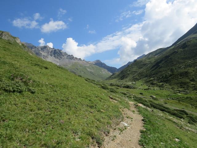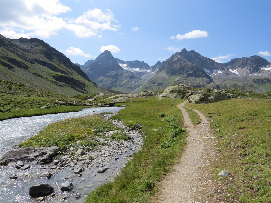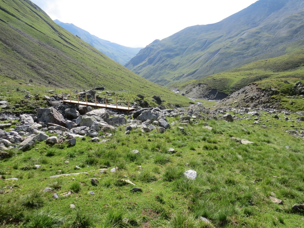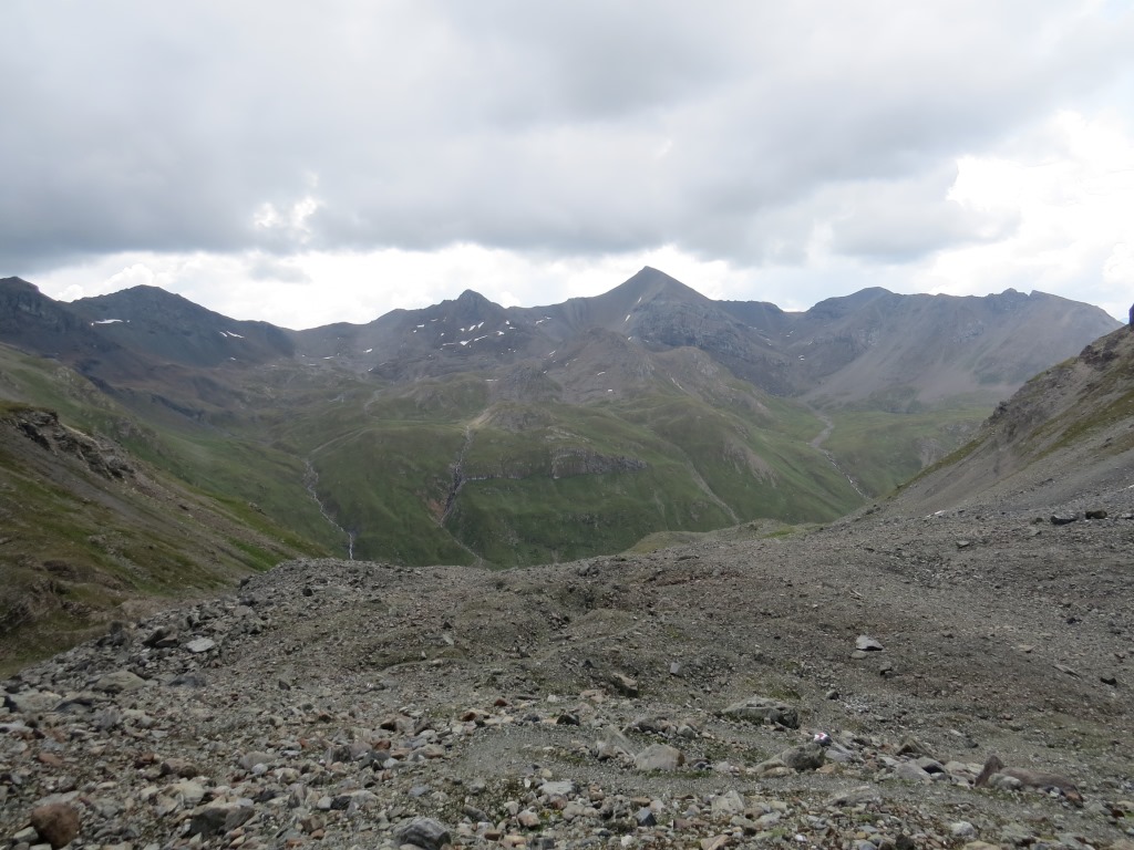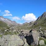 von der Weggabelung blicken wir in den Talboden hinunter und zur Chamonna Tuoi