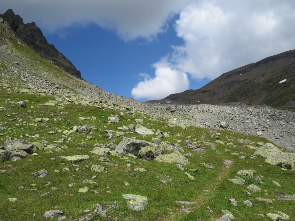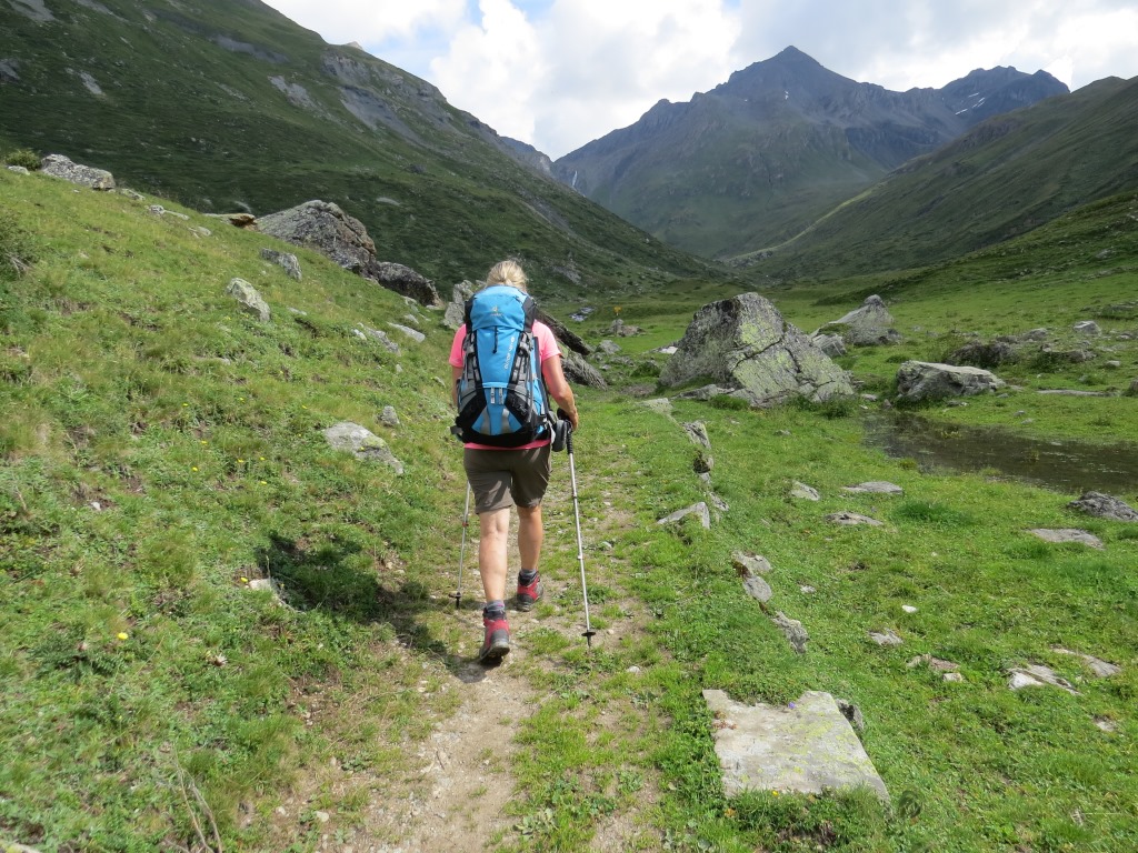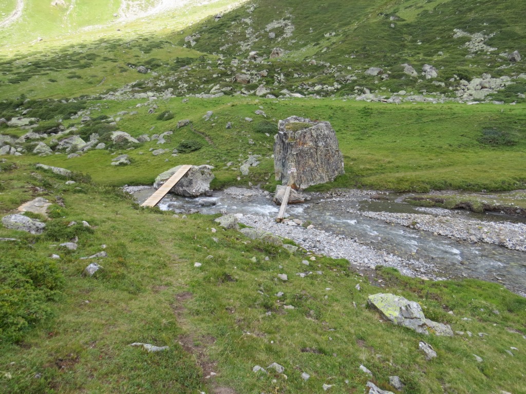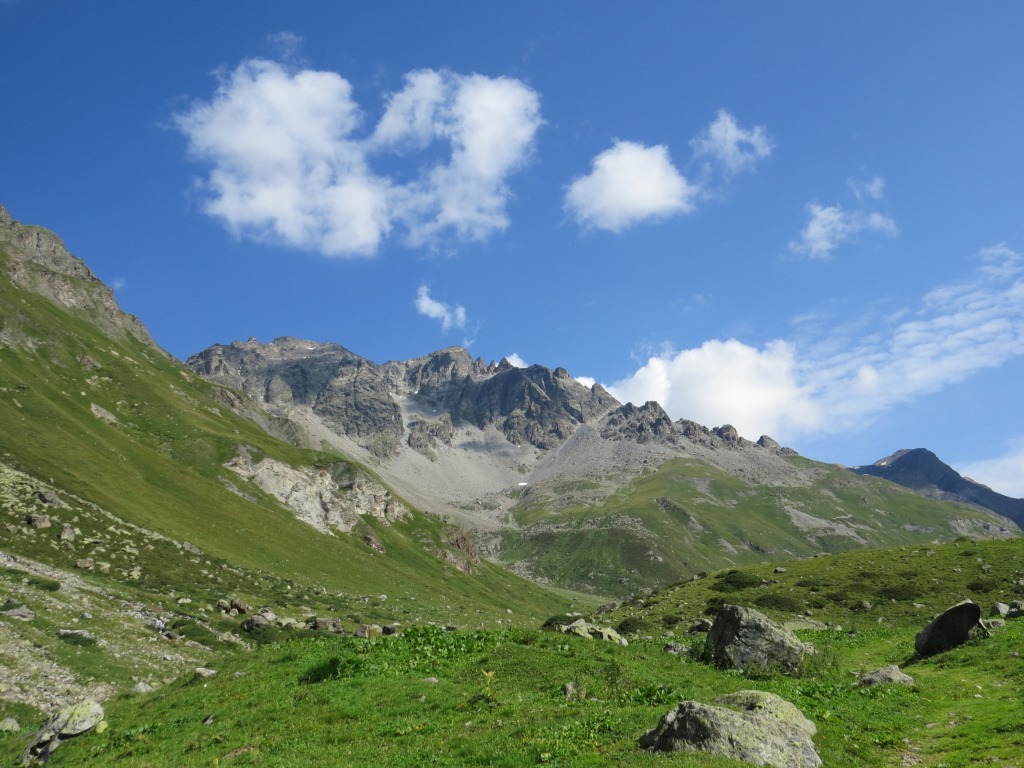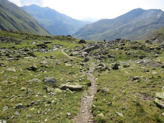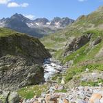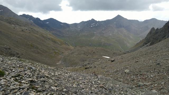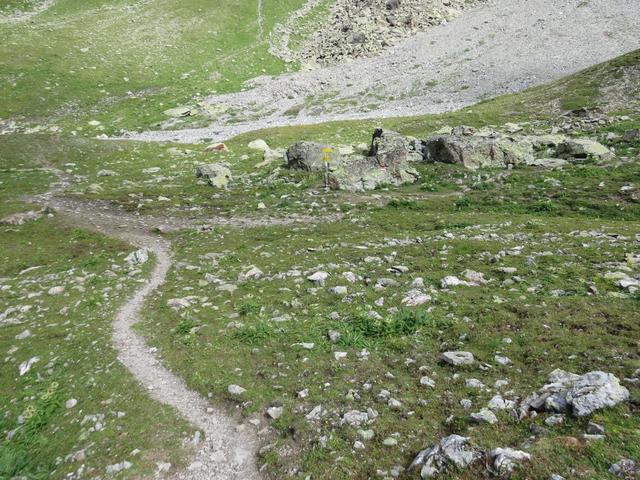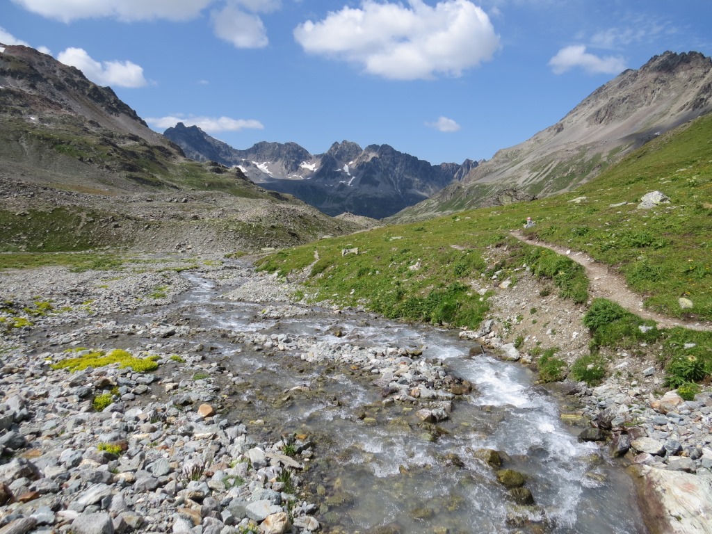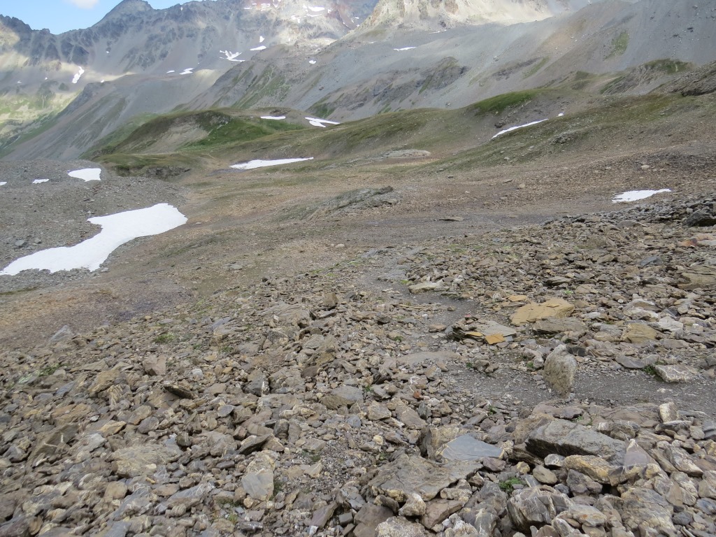 von der Weggabelung blicken wir in den Talboden hinunter und zur Chamonna Tuoi