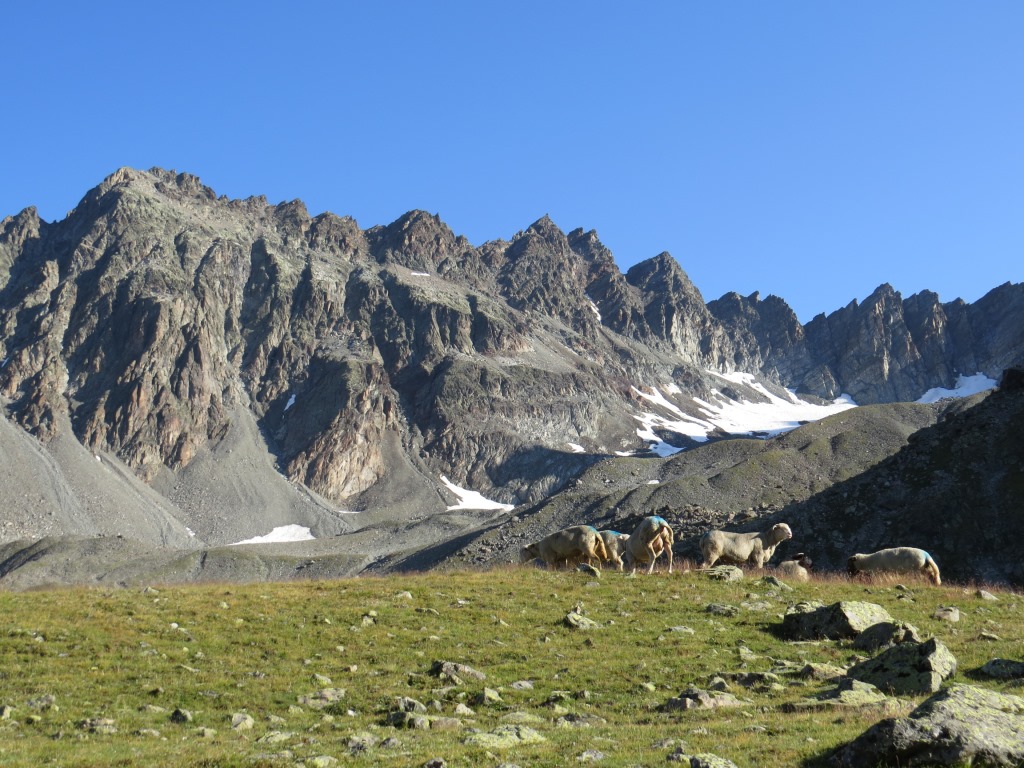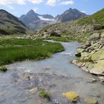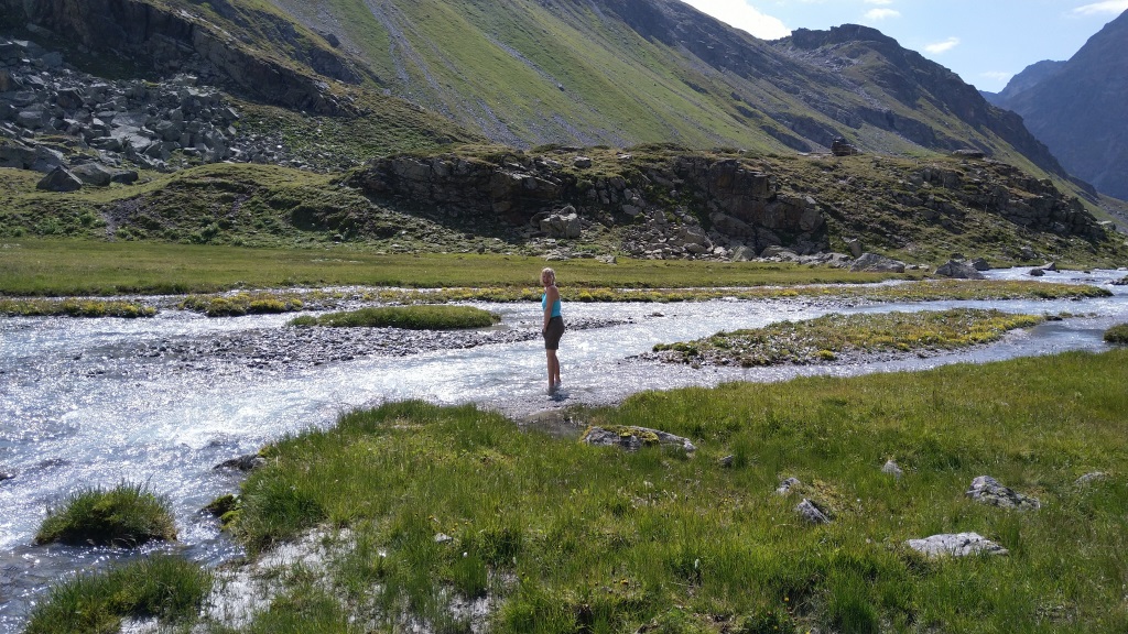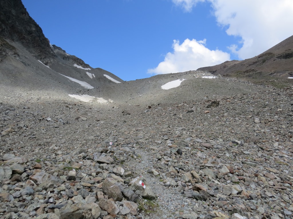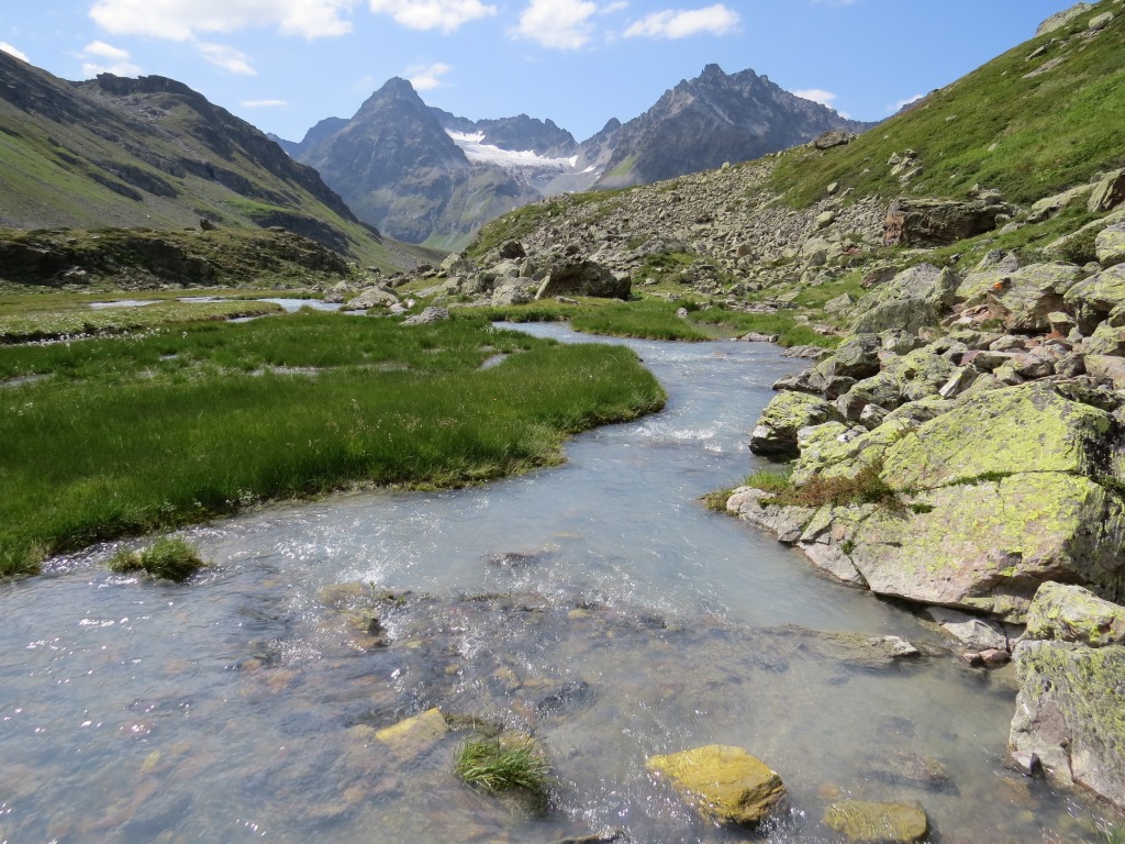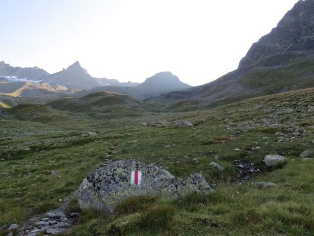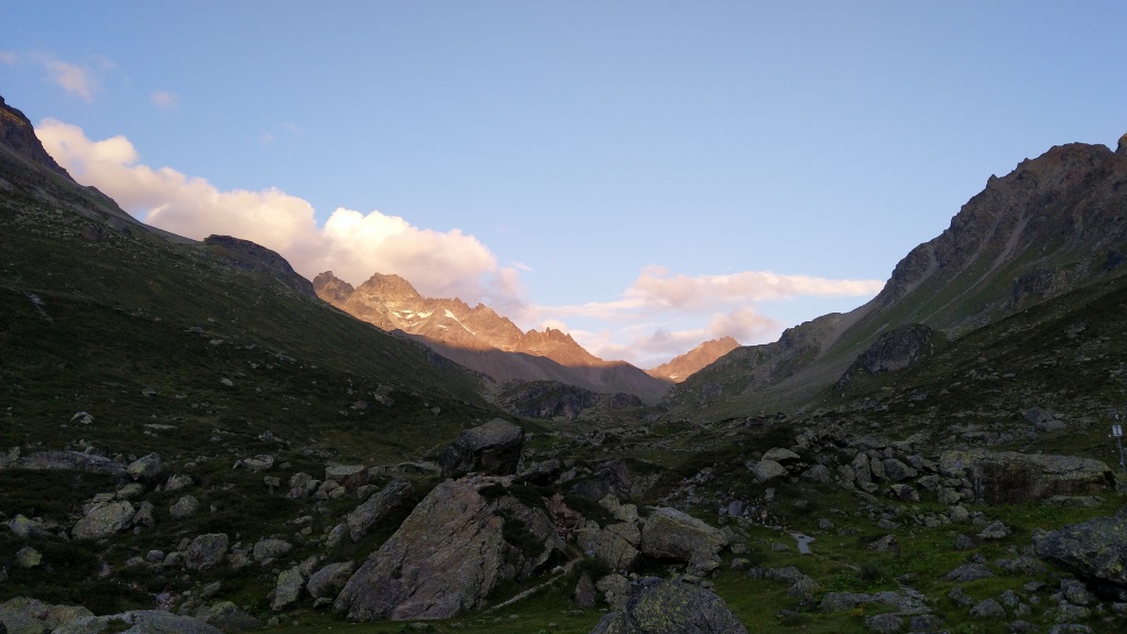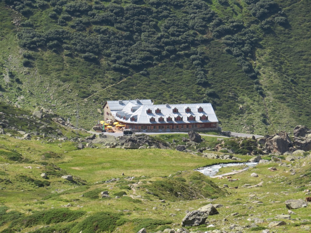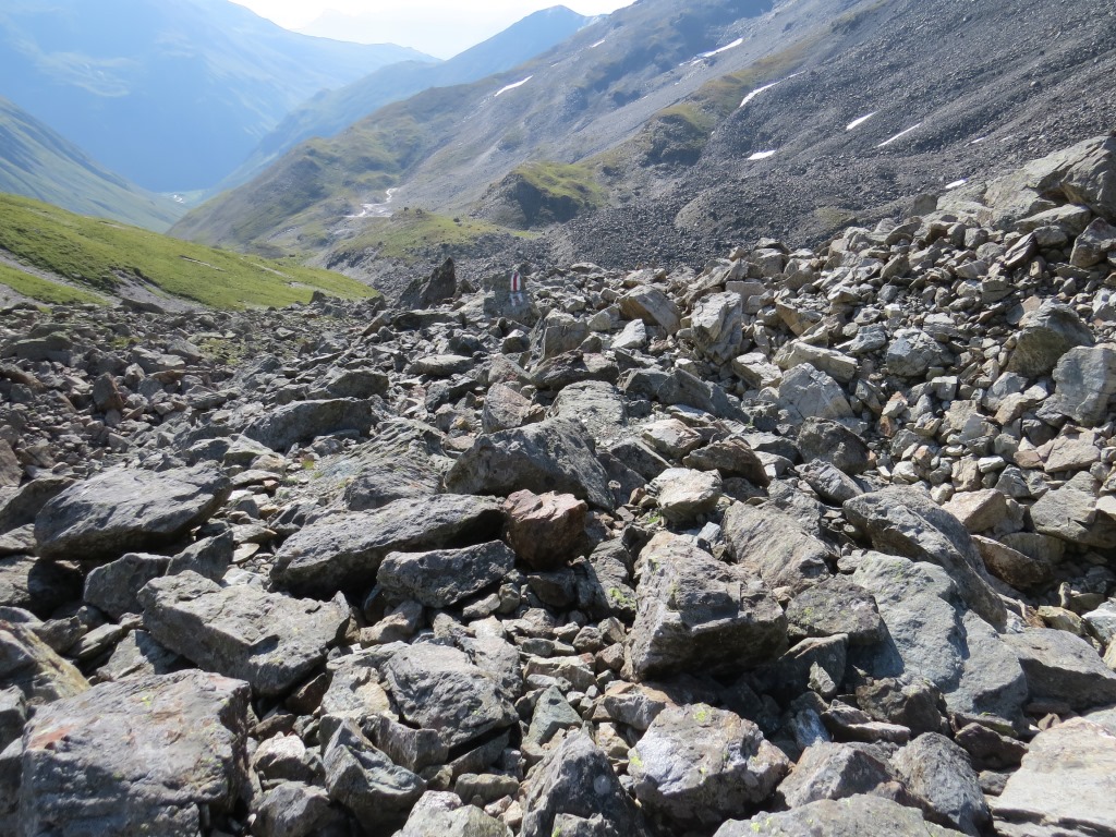 von der Weggabelung blicken wir in den Talboden hinunter und zur Chamonna Tuoi