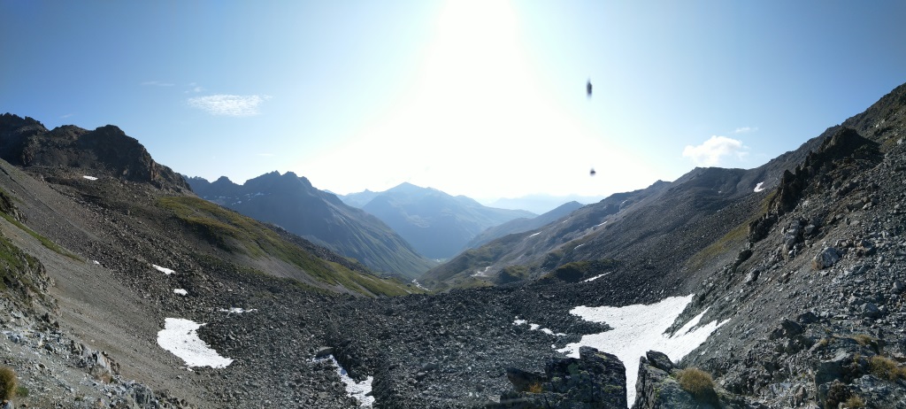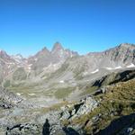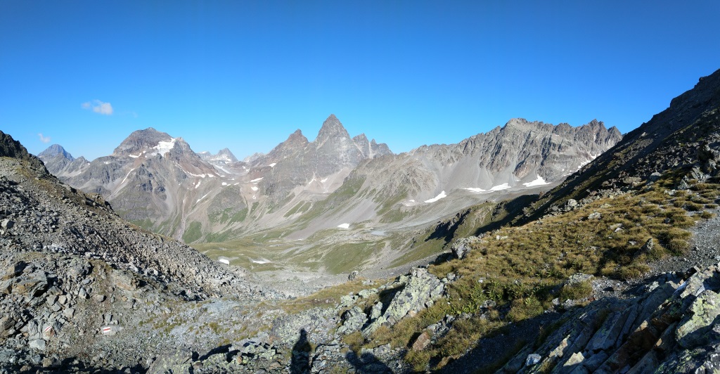wir blicken zurück und bestaunen Piz Fliana, Verstanclahorn, Silvretta und die beiden Piz Buin