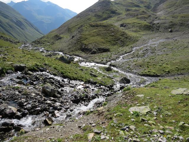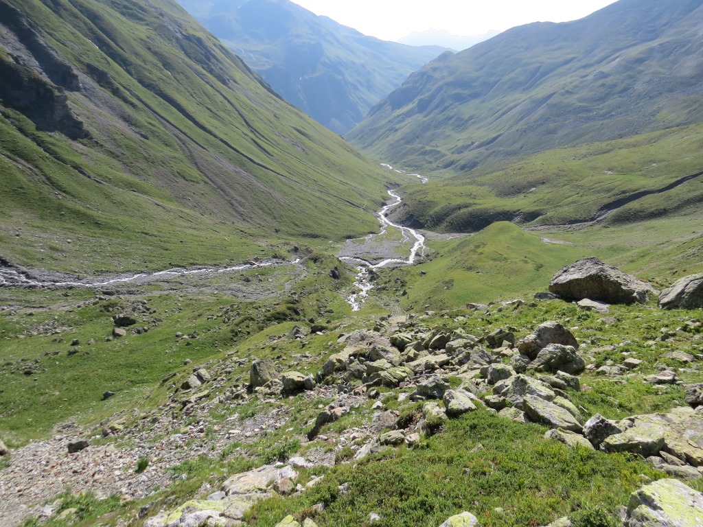 wir blicken zurück. Tief unter uns, dort wo es grün ist, liegt das Val Urschai