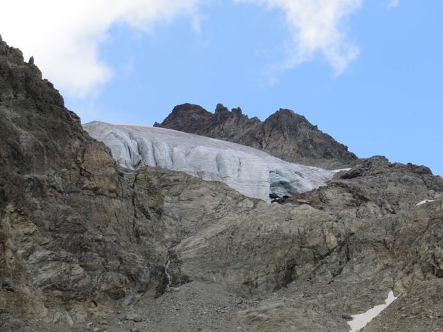 links von uns können wir den Hängegletscher Vadret Futschöl bestaunen