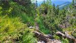 er führt über einen schmalen, wurzeligen Pfad durch Latschenbewuchs